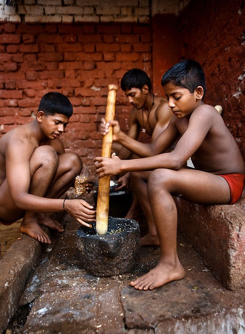 Most akharas are associated with a guru, called a palawan. This venerated teacher is a holy man who trains the wrestlers with the assistance of older wrestlers. Above you see a few typical early morning scenes in a local akhara. The small dumbbells are used for young children’s practice sessions.